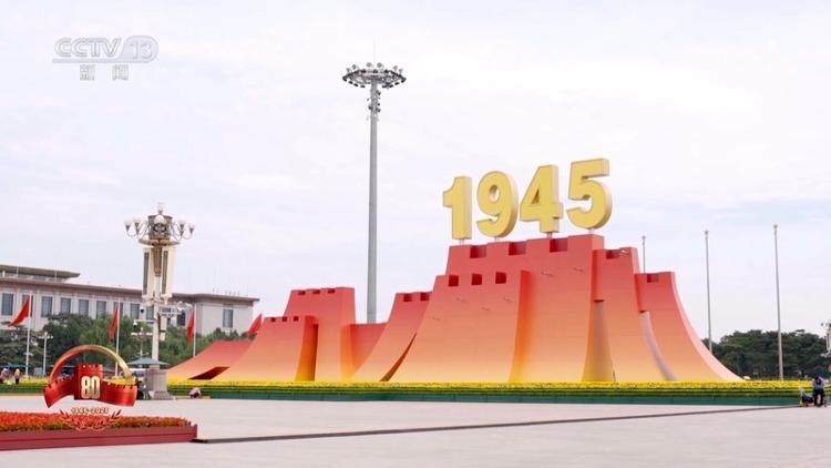 两座巍峨的年号台托举着“1945”和“2025”金色年号