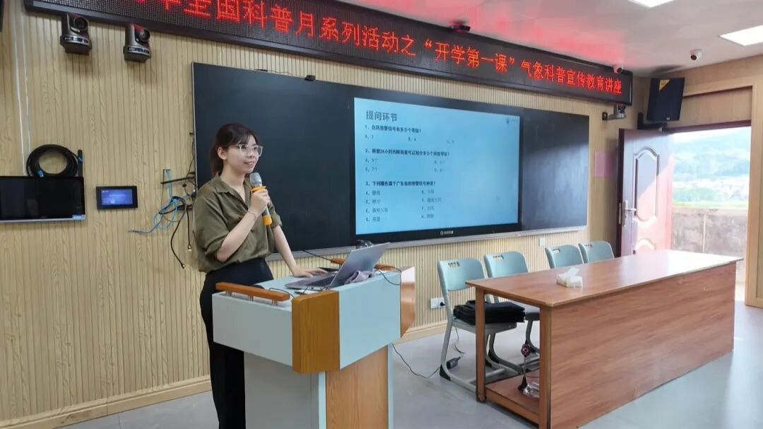 在气象科普讲座上,气象局专家结合案例,用通俗语言讲解气象灾害预警信号、台风暴雨及雷电防御知识,师生们专注记录,专家互动答疑,有效提升师生防灾应急与自我保护能力。