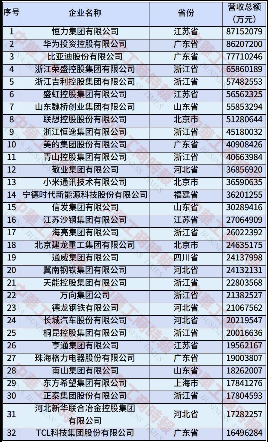 【大河财立方消息】8月28日配资资讯专业网,全国工商联发布2025中国制造业民营企业500强榜单。恒力集团、华为投资控股有限公司、比亚迪、浙江荣盛控股集团、吉利控股集团位列前五。
